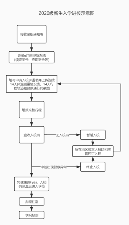 (五)9月3日报到当天,新生可乘学校安排的接站车或采用其他交通方式到达校门口,凭健康通行码“绿码”、录取通知书、入校码并测温正常后从东大门独立进校。乘坐私家车来校学生,车辆送至学校缓冲区即刻返回。学生凭迎新系统住宿等信息进入所住园区及所属学院办理报到手续。